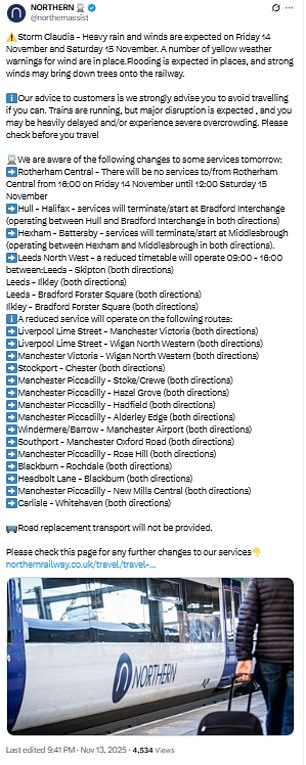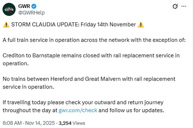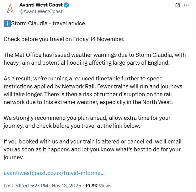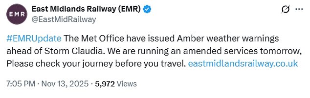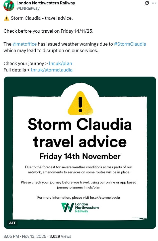 It said it has been working with emergency services and local authorities to ensure they are fully prepared for when the storm hits today.