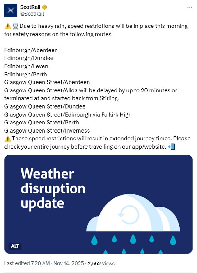National Rail warned of disruption, with flooding between Exeter and Barnstaple in Devon affecting trains until Sunday and emergency speed restrictions in Scotland.