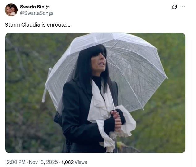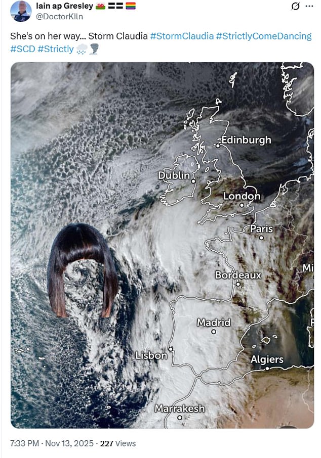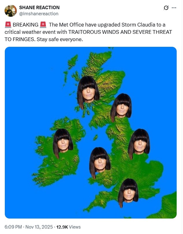 Some social media users made light of the storm, posting memes of The Traitors host Claudia Winkleman – with one tweeting: ‘BREAKING. The Met Office have upgraded Storm Claudia to a critical weather event with TRAITOROUS WINDS AND SEVERE THREAT TO FRINGES. Stay safe everyone.’