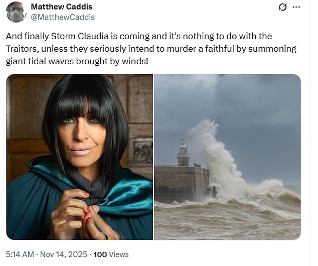 Another posted: ‘And finally Storm Claudia is coming and it’s nothing to do with the Traitors, unless they seriously intend to murder a faithful by summoning giant tidal waves brought by winds!’