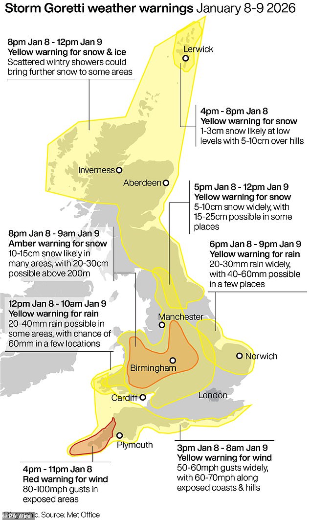 Met Office meteorologist Alex Burkill said the storm will bring ‘wet, windy and wintry weather’ to parts of the UK. Goretti, named by Meteo France, will bring ‘some strong winds and some significant snow to central and perhaps southern parts’.