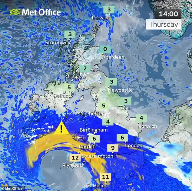 A Cabinet Office spokesman said: ‘The Met Office has issued a red warning for the Isles of Scilly and Cornwall from 4pm until 11pm on Thursday January 8.