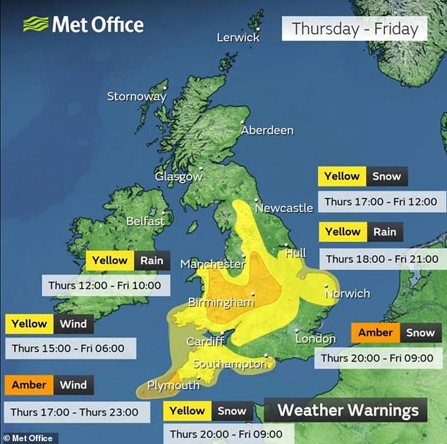 National Highways issued an amber snow alert for the Midlands, from 6pm Thursday until 9am on Friday, amid concerns for drivers on routes around Birmingham across to Leicester and Nottingham. The warning stated: ‘You may wish to delay your journey.’