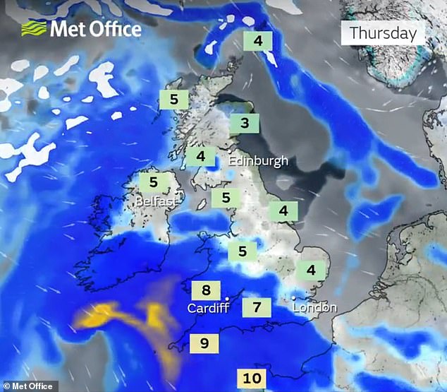 An amber warning for high winds has also been issued for the tip of Cornwall on Thursday from 5pm until 11pm, which means there will be a ‘danger to life’ from large waves and debris being thrown onto beachfront roads and properties.