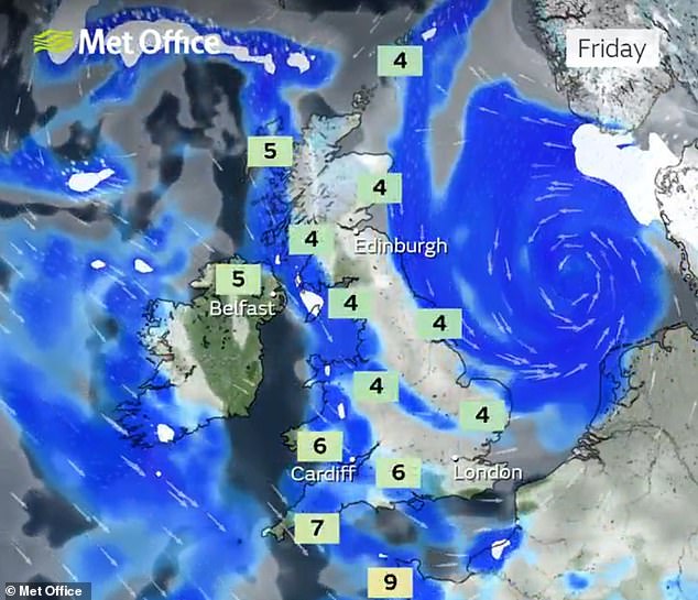 He explained: ‘It’ll remain cold or very cold to start the weekend, although for most it will be dry. We then have very large uncertainties in the forecast by Sunday and Monday as milder air from the Atlantic tries to displace the cold air over the UK.
