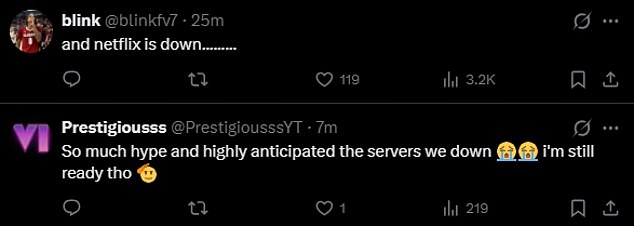 Another said, ‘and netflix is down……..,’ and a viewer commented, ‘So much hype and highly anticipated the servers we down i’m still ready tho.’