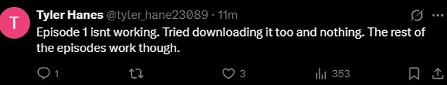 A viewer pointed out, ‘Everyone going to Twitter to see if Netflix crashed,’ and one typed, ‘Episode 1 isn’t working. Tried downloading it too and nothing. The rest of the episodes work though.’