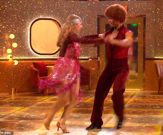Later speaking to host Claudia Winkleman, an emotional Alex said: ‘It’s never really discussed when your at the sharp end, how our bodies are suffering and my 62-year-old self is saying, what are you saying, but my spirit and soul is saying [puts finger in her ears] la la la, I don’t want to know, I want to keep dancing’.