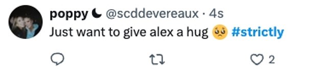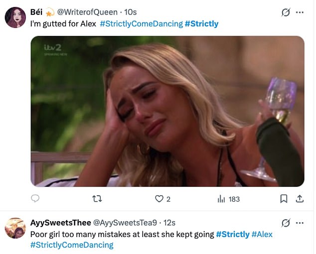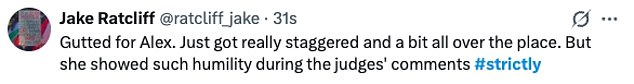Taking to X fans said: ‘Gutted for Alex. Just got really staggered and a bit all over the place. But she showed such humility during the judges’ comments’