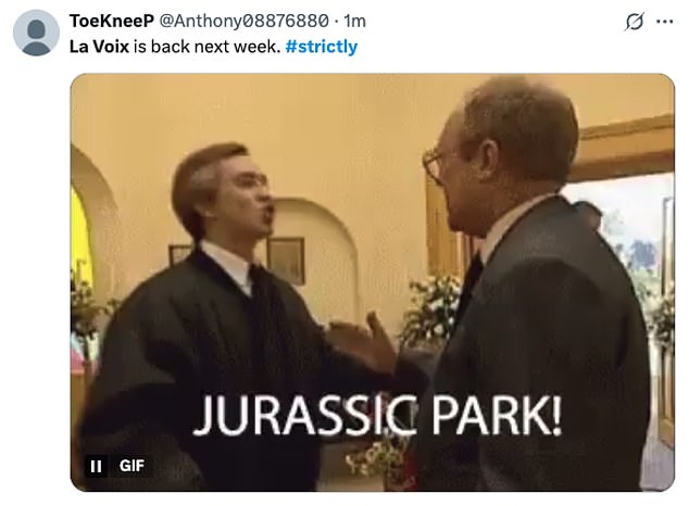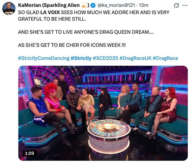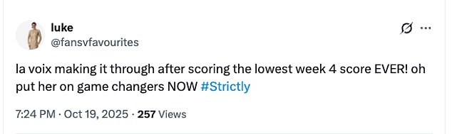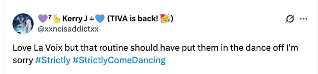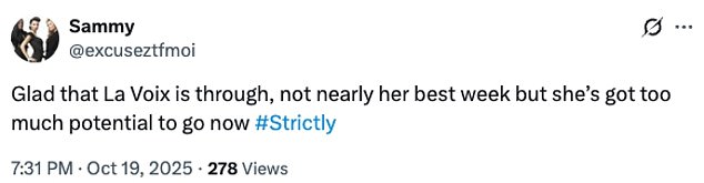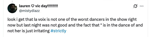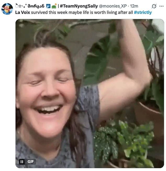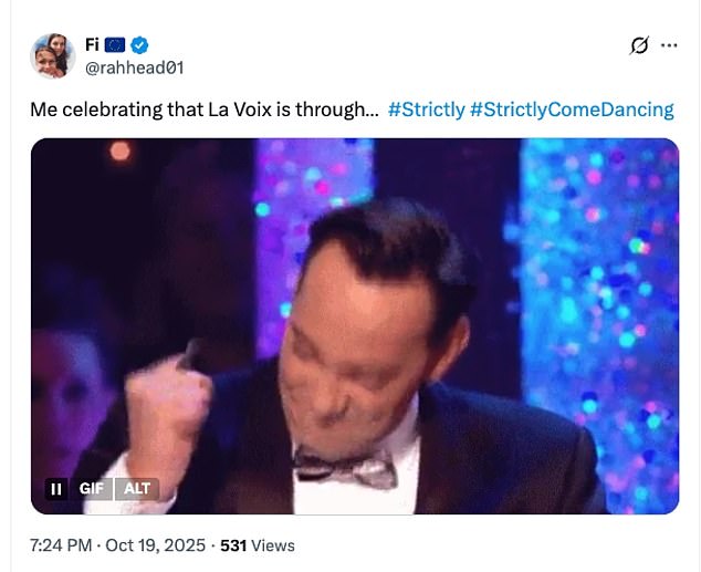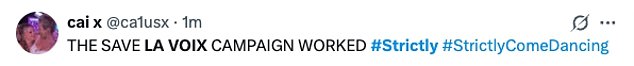 While others congratulated their fellow strictly fans for securing the star a spot in next week’s show: ‘La Voix survived! We believe in you La Voix, time to redeem yourself mother for next week’: ‘The Save La Voix campaign worked’: ‘Me celebrating that La Voix is through!’