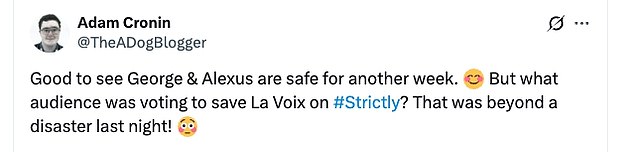 ‘Good to see George and Alexus safe for another week. But what audience was voting to save La Voix? That was beyond a disaster last night!’: ‘Love La Voix but that routine should have out them in the dance off I’m sorry’: ‘Love her but it should have been La Voix tonight’.