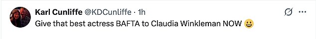 They penned: ‘Give that best actress BAFTA to Claudia Winkleman NOW’,