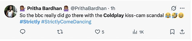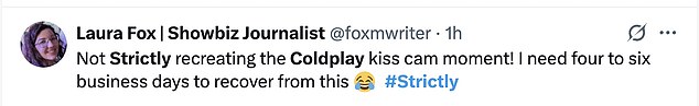 ‘Not Strictly recreating the Coldplay kiss cam moment! I need four to six business days to recover from this #Strictly’,