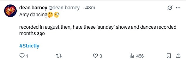 They posted on X: ‘Amy dancing, recorded in August then, hate these ‘Sunday’ shows and dances recorded months ago.’