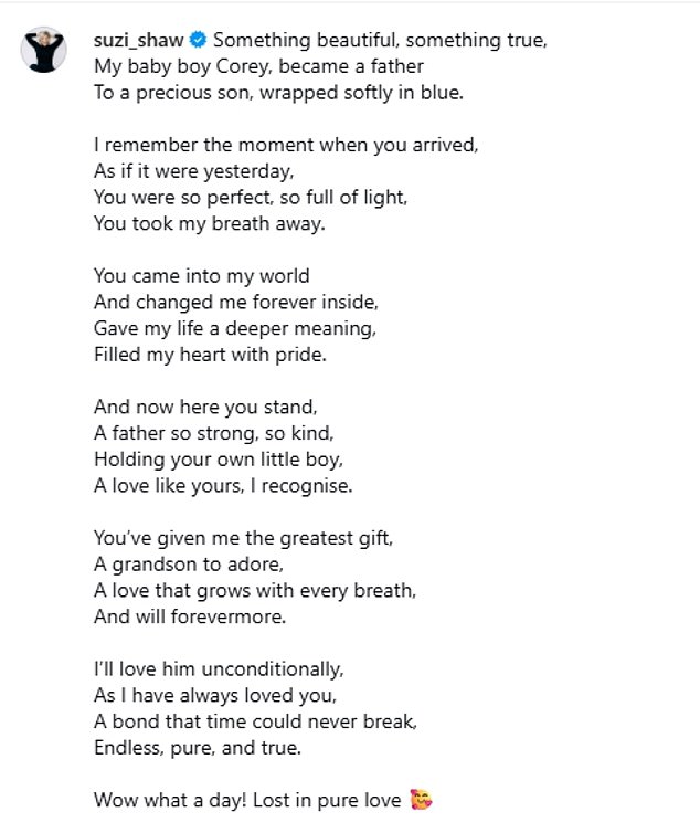 Suzanne was overcome with emotion as she wrote: 'Something beautiful, something true, My baby boy Corey, became a father To a precious son, wrapped softly in blue'