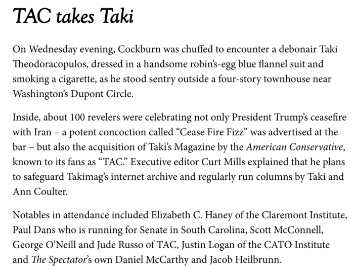 Second, as of January 2026, TAC has taken over Taki’s Magazine. Taki is a cofounder and longtime friend of The American Conservative, and we are delighted all to be living under one roof again and bringing TakiMag’s irreverent flair into a new era. The TakiMag archives will still be available at the takimag.com URL, but all new content will be hosted on the TAC website.