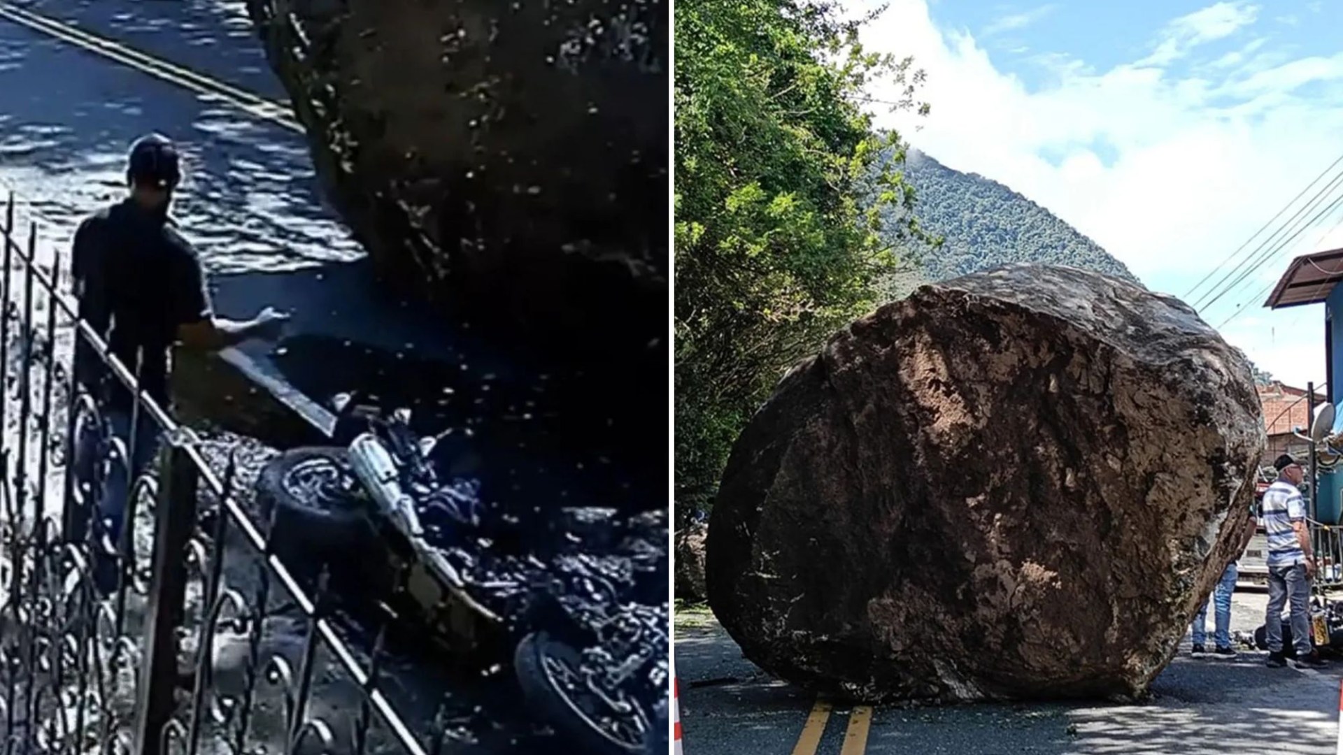 THIS is the terrifying moment a giant boulder plummets onto a main road, crushing a motorbike beneath it — yet the rider astonishingly walks away unscathed.