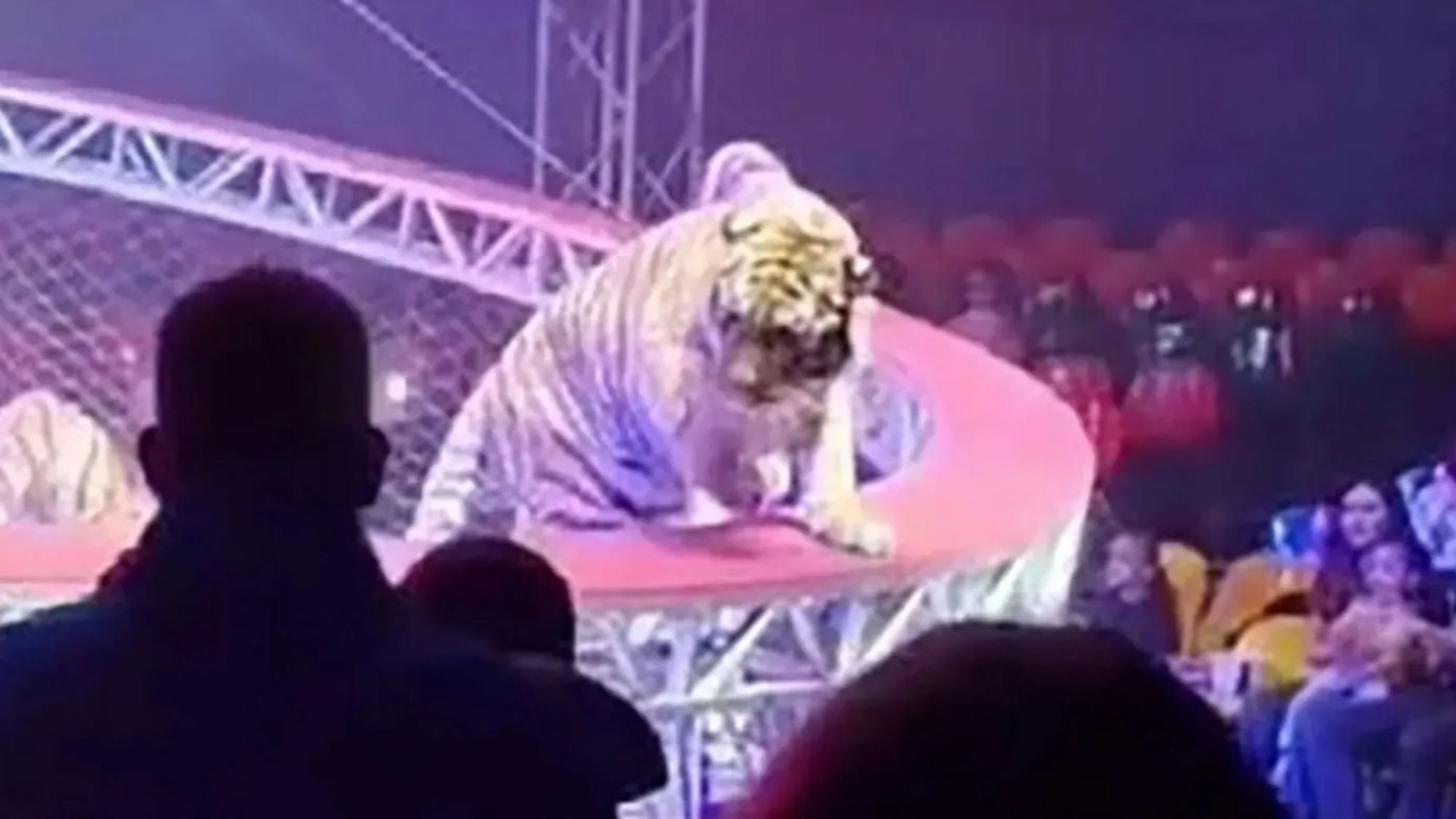 Shocking footage from inside the tent was captured by audience members, showing the moment one of three performing tigers went rogue.