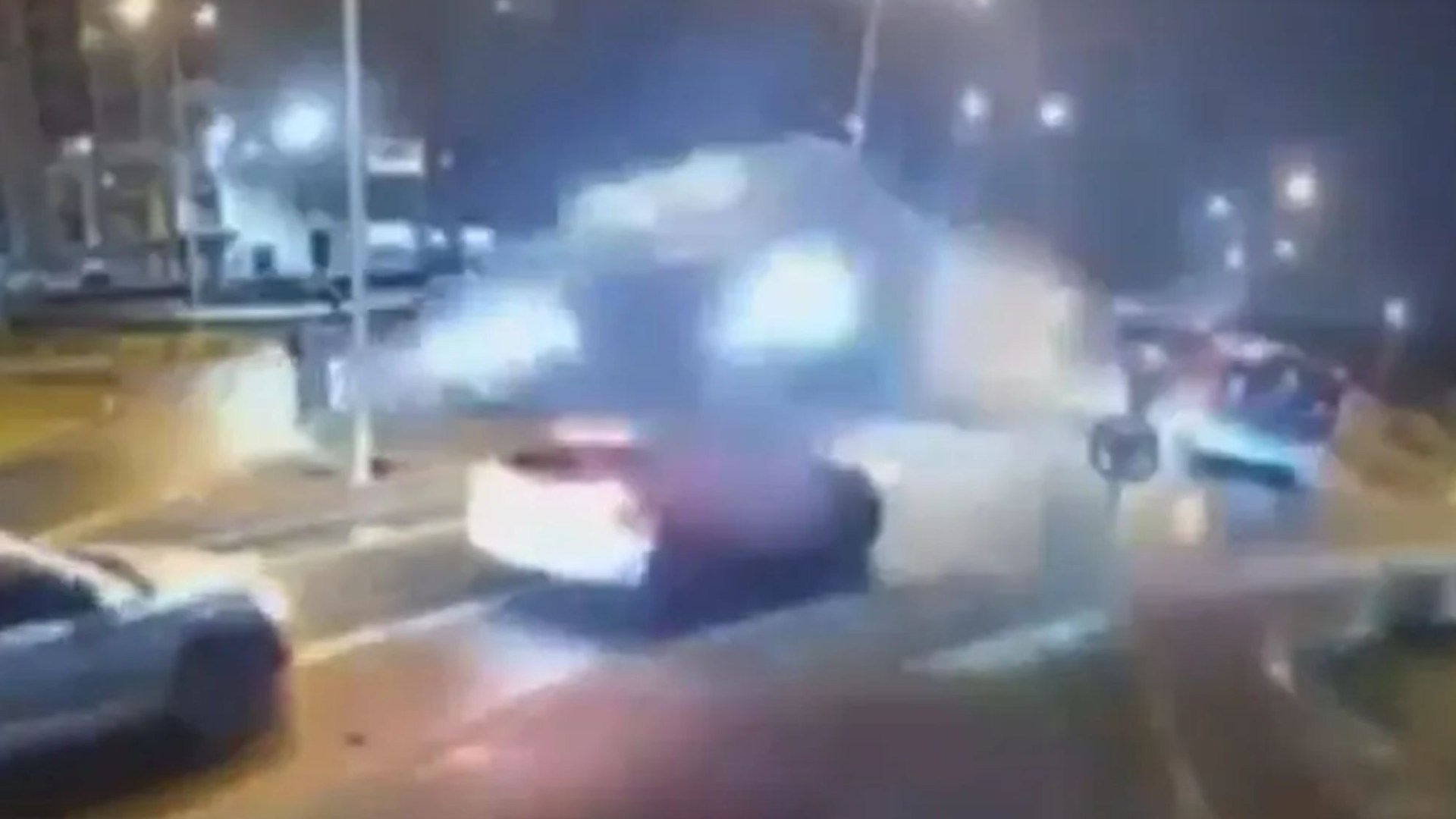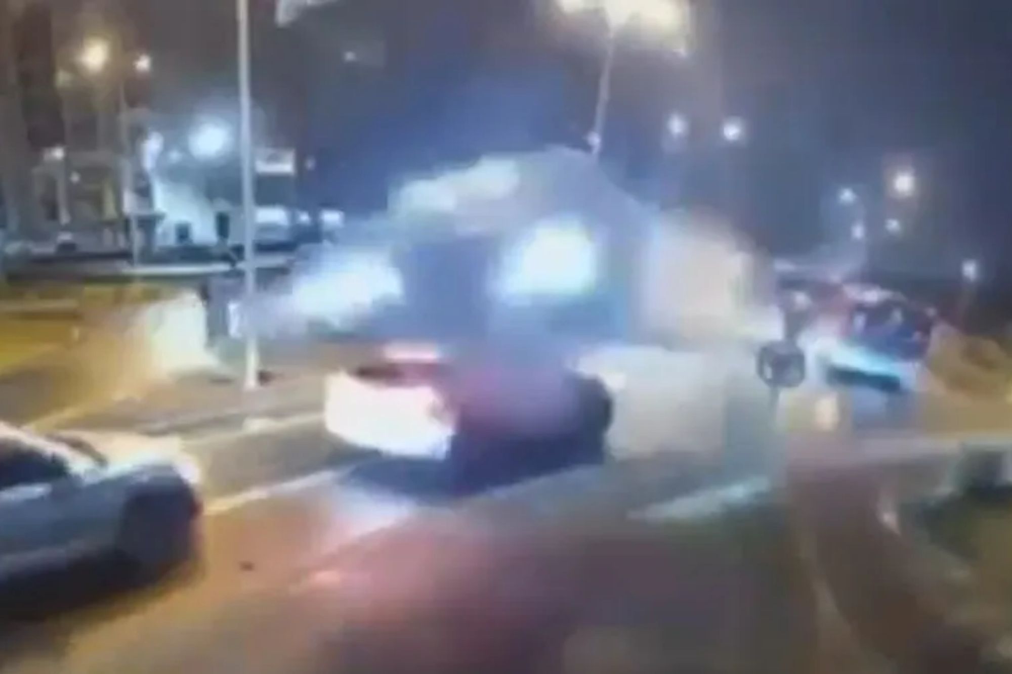 Shocking CCTV footage shows the car speeding straight at a roundabout, clipping the kerb and being launched sky-high at lightning speed.
