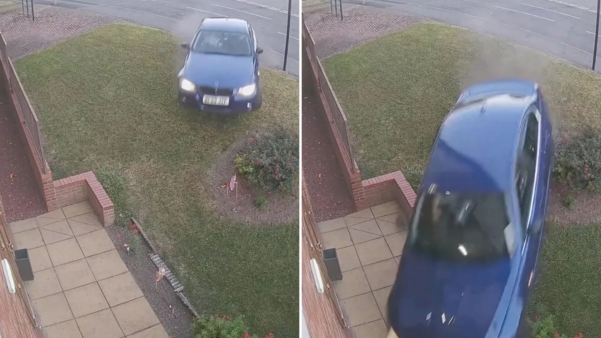 It hits a grass verge and can be seen flying through the air as it slams into the care home.