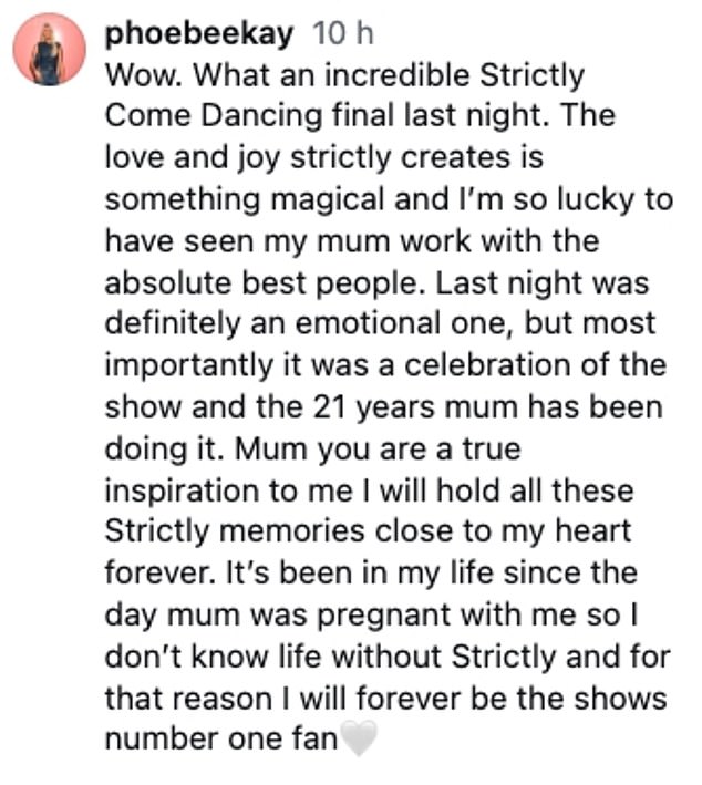 ‘Last night was definitely an emotional one, but most importantly it was a celebration of the show and the 21 years mum has been doing it. Mum you are a true inspiration to me I will hold all these Strictly memories close to my heart forever’.