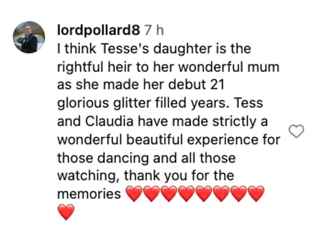 Fans gushed in the comments: ‘I think Tess’s daughter is the rightful heir to her wonderful mum as she made her debut 21 glorious glitter filled years. Tess and Claudia have made strictly a wonderful beautiful experience for those dancing and all those watching, thank you for the memories’.