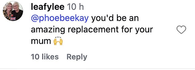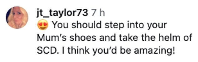 While more added: ‘You should step into your Mum’s shoes and take the helm of SCD. I think you’d be amazing!’: ‘You’d be an amazing replacement for your mum’.