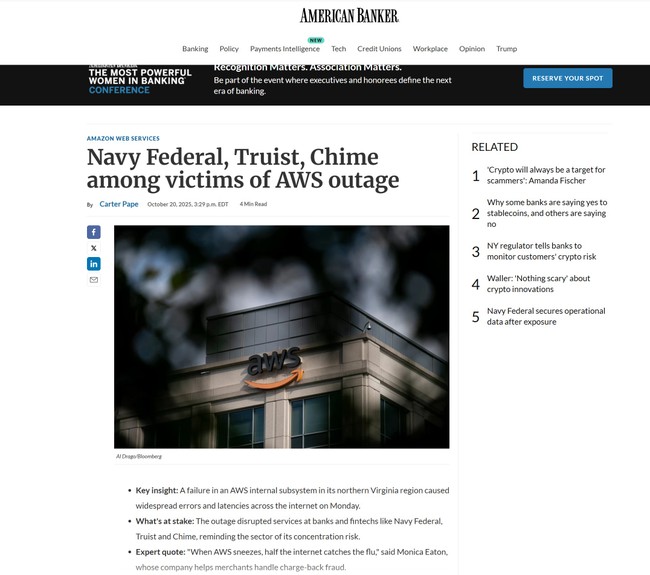 …Bloomberg reports that yesterday’s AWS outage in the U.S. East 1 region was one of the company’s worst disruptions since 2021. The incident could prompt companies to diversify their cloud infrastructure risk, potentially slowing AWS’ growth while intensifying competition from Microsoft and Google.