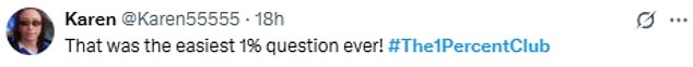 Taking to X, formerly Twitter, some viewers said: ‘Easiest bl***y 1% question ever???’