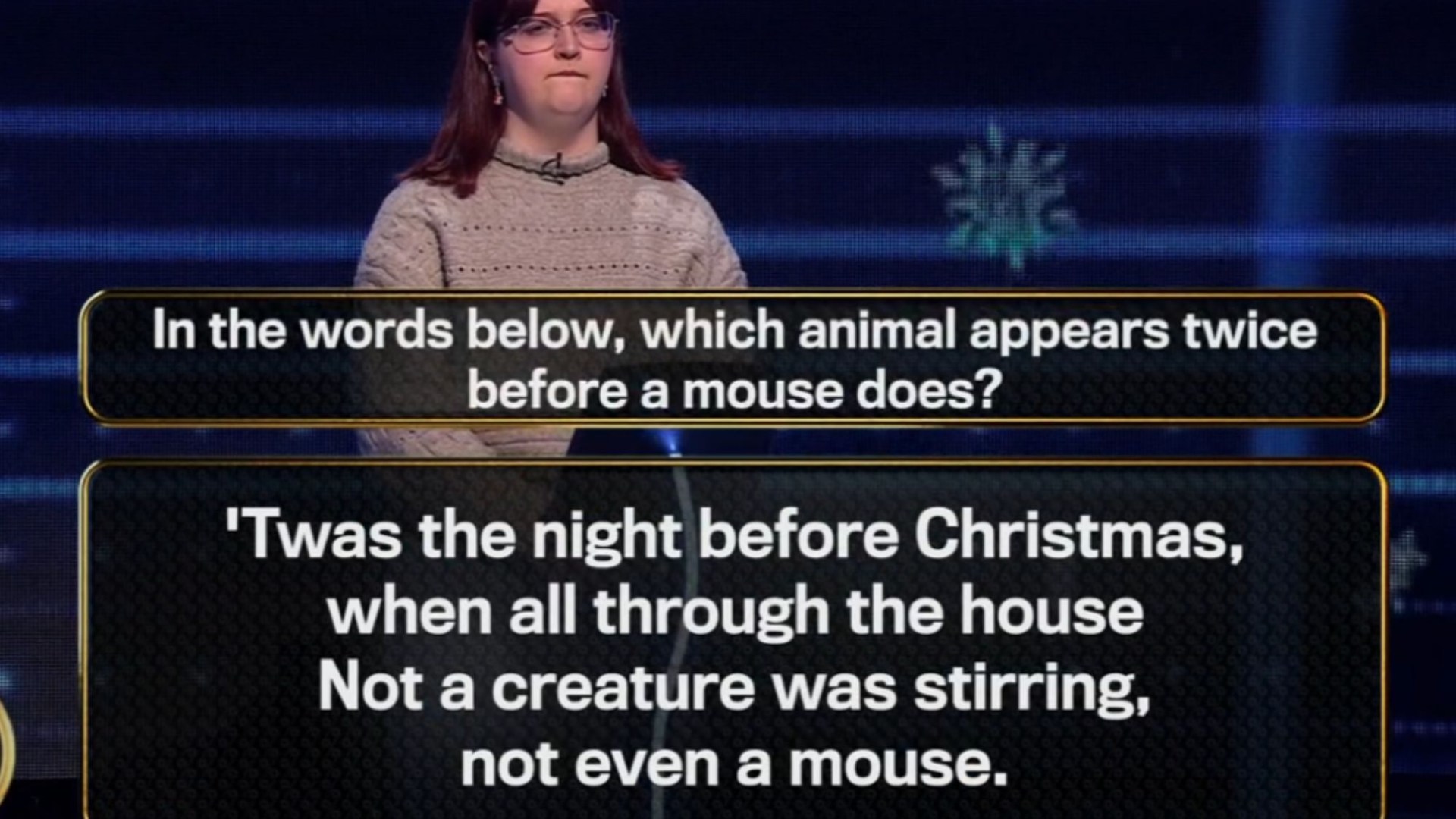 He then revealed the question which was: “In the words below, which animal appears twice before a mouse does?”