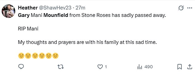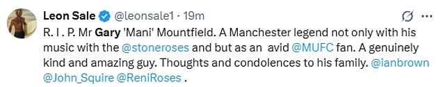 ‘All our love goes out to the Mounfield family, the Roses community, and everyone feeling this loss today. Rest easy Mani. Manchester’s beat won’t ever be the same.’