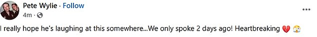 Rock band Echo & the Bunnymen said: ‘I’m absolutely gutted to hear the news about Mani, who I have always loved and always will love, deeply and forever. Like a brother. I am in shock to be honest. Please tell me I’m just having a bad, bad dream. My thoughts and feelings and Manilove to all of his family from me Mac Bunnyman Xxx ❤️.’