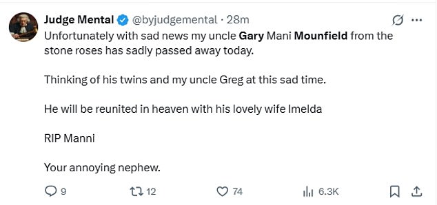 Others wrote: ‘Unfortunately with sad news my uncle Gary Mani Mounfield from the stone roses has sadly passed away today. Thinking of his twins and my uncle Greg at this sad time. He will be reunited in heaven with his lovely wife Imelda. RIP Manni. Your annoying nephew.’