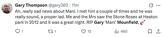 ‘Really sad news about Mani. I met him a couple of times and he was really sound, a proper lad. Me and the Mrs saw the Stone Roses at Heaton park in 2012 and it was a great night. RIP.’
