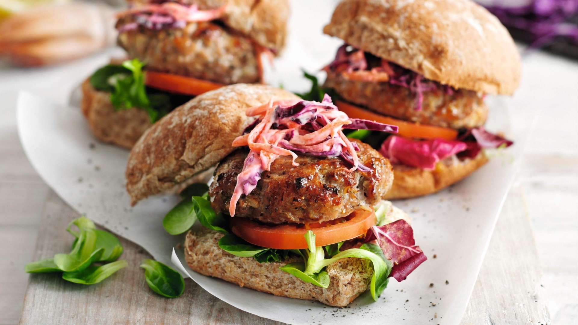 Pack the salad leaves, tomatoes, burgers and a little slaw into the rolls and serve with the rest of the slaw on the side.