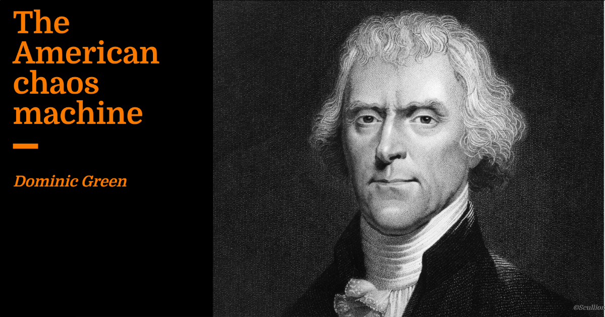 In his Farewell Address of 1796, George Washington invoked a vision of “one People, under an efficient government”. This was too much to ask. Americans are too various. America is too large. America is a revolutionary society, founded on sectarian violence and highly tolerant of risk. After the Louisiana Purchase of 1803, Thomas Jefferson told the English radical Joseph Priestley he didn’t think it “very important” whether Americans remained “in one confederacy” or formed into “Atlantic and Mississippi confederacies”. The federal state was barely half-built, and Jefferson was already prepared to let it blow up.