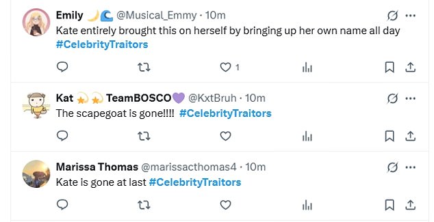 ‘Kate entirely brought this on herself by bringing up her own name all day’; ‘Hot take: Kate shouldve been the first to go but I’m happy she stayed this long obvi’.