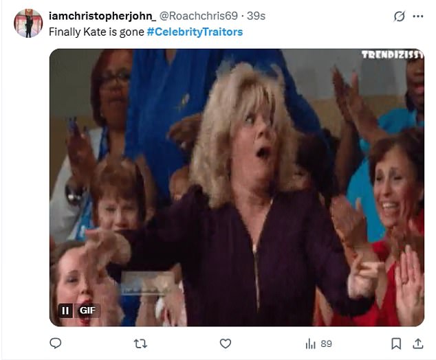 Taking to X fans rejoiced that Kate’s game had finally come to an end as they penned: ‘Kate is gone at last’; ‘The scapegoat is gone!!!!’; ‘Finally Kate is gone’; ‘