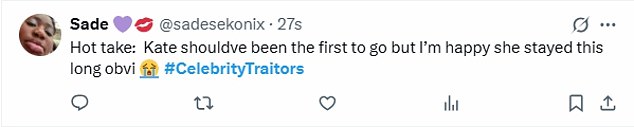 ‘Considering Kate was suspected of being a Traitor from almost day 1 and has seemingly been completely clueless throughout its a miracle she’s lasted this long. Well done!’.
