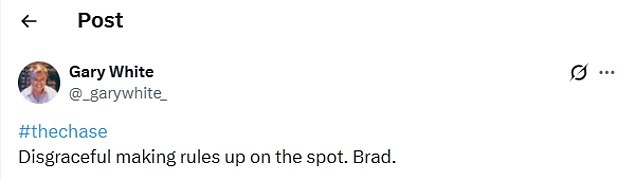 In response to what occurred, a viewer wrote on X: ‘Disgraceful making rules up on the spot. Brad.’