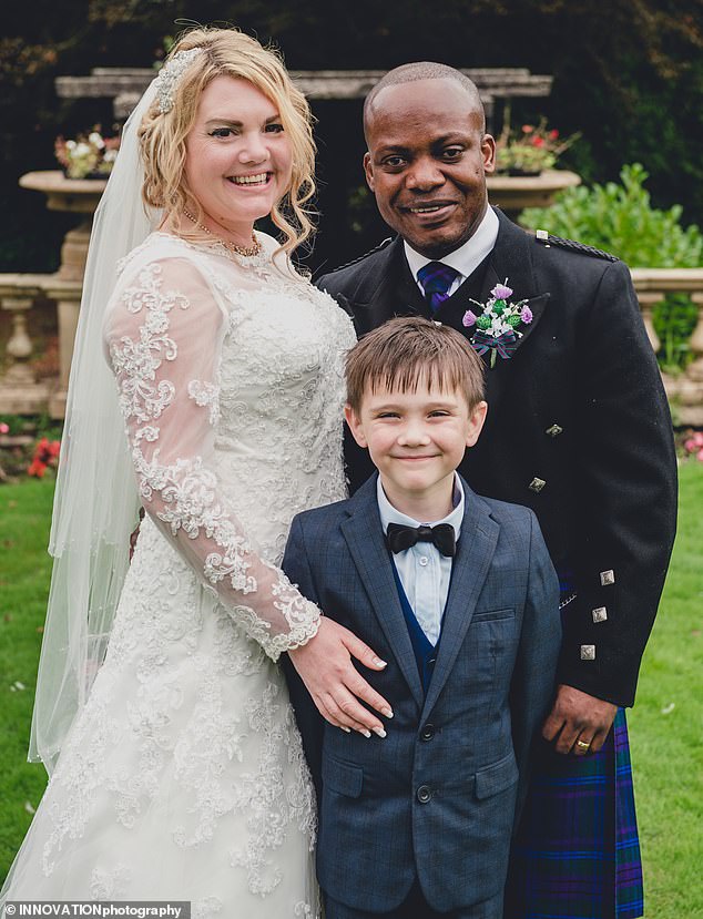 Charmain Speirs and Eric Adusah on their wedding day in 2014 with her son Isaac, then seven