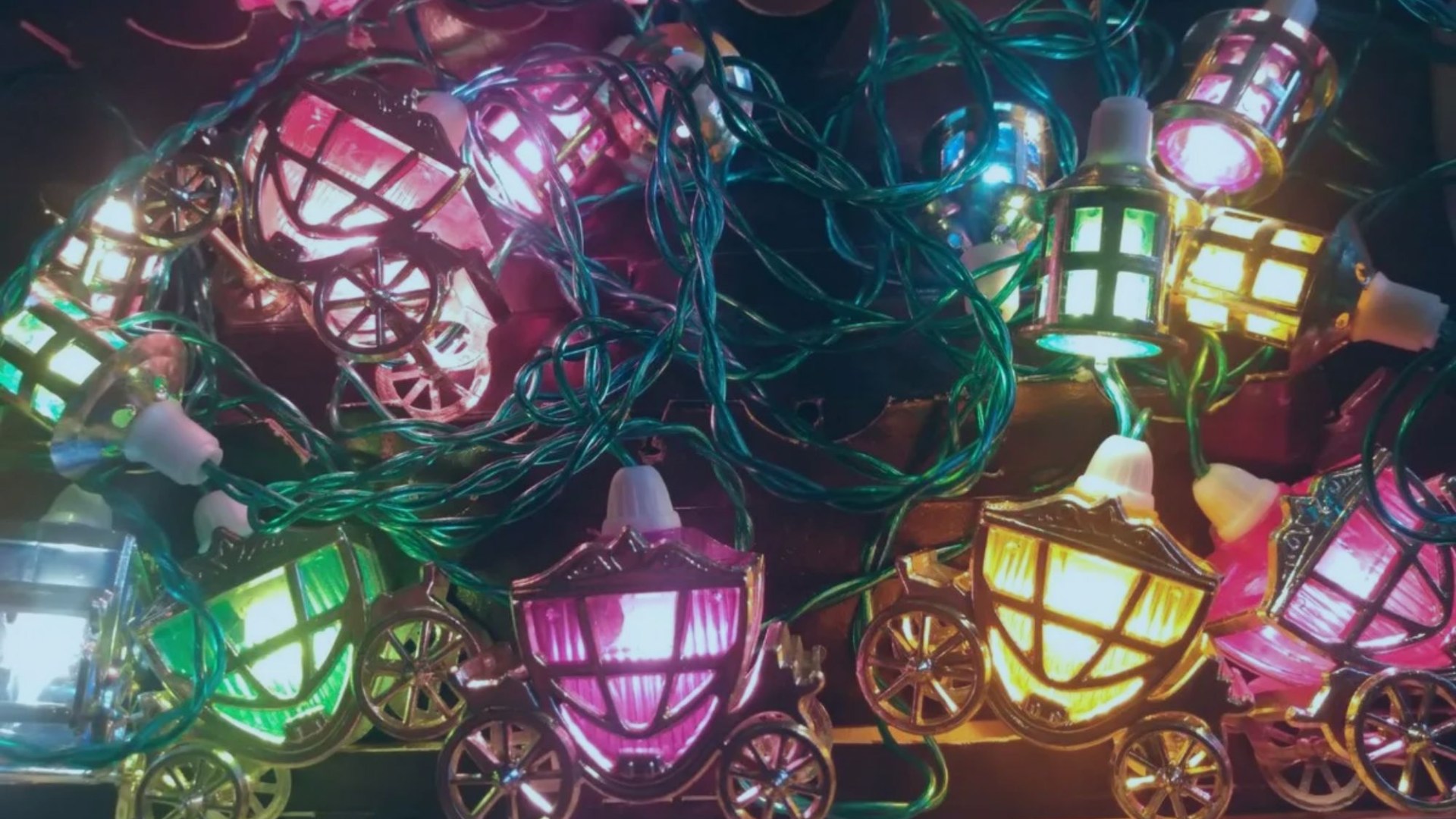 The sets were classic in the UK back in the day, and feature a string of lights with plastic Cinderella coach shades and small lanterns.
