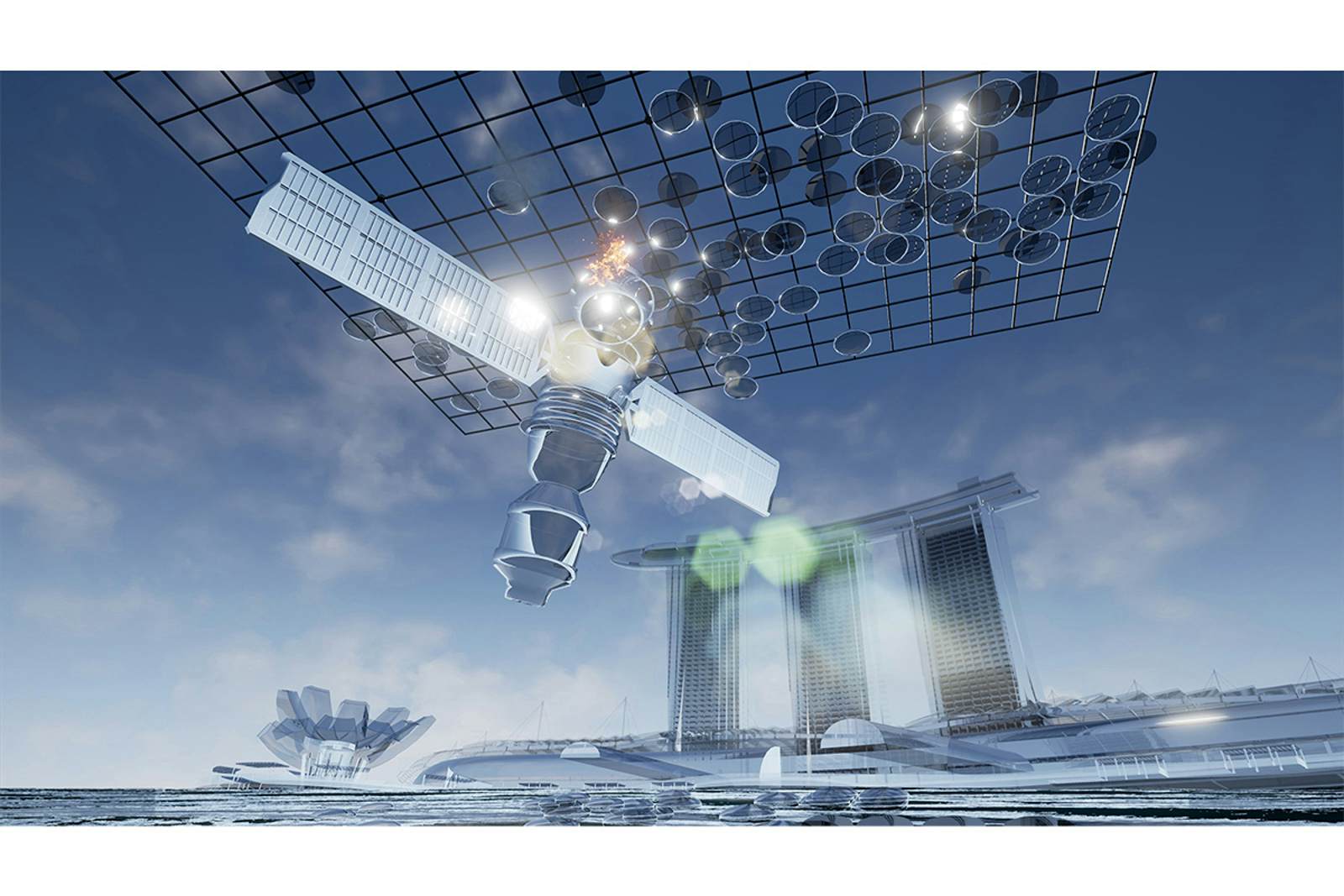 The video presents the struggle between “bio-supremacist” humans and machines denied self-expression in computer-rendered, saturated tones that allow the gallery to identify with the robot’s struggle and project an emancipatory motive onto the work (the exhibition guide describes it as a “coming-of-age tale” and refers to the satellite as a “they/them” as a term of endearment, for example), even as Lek shows a world of mass surveillance evacuated of humanity.