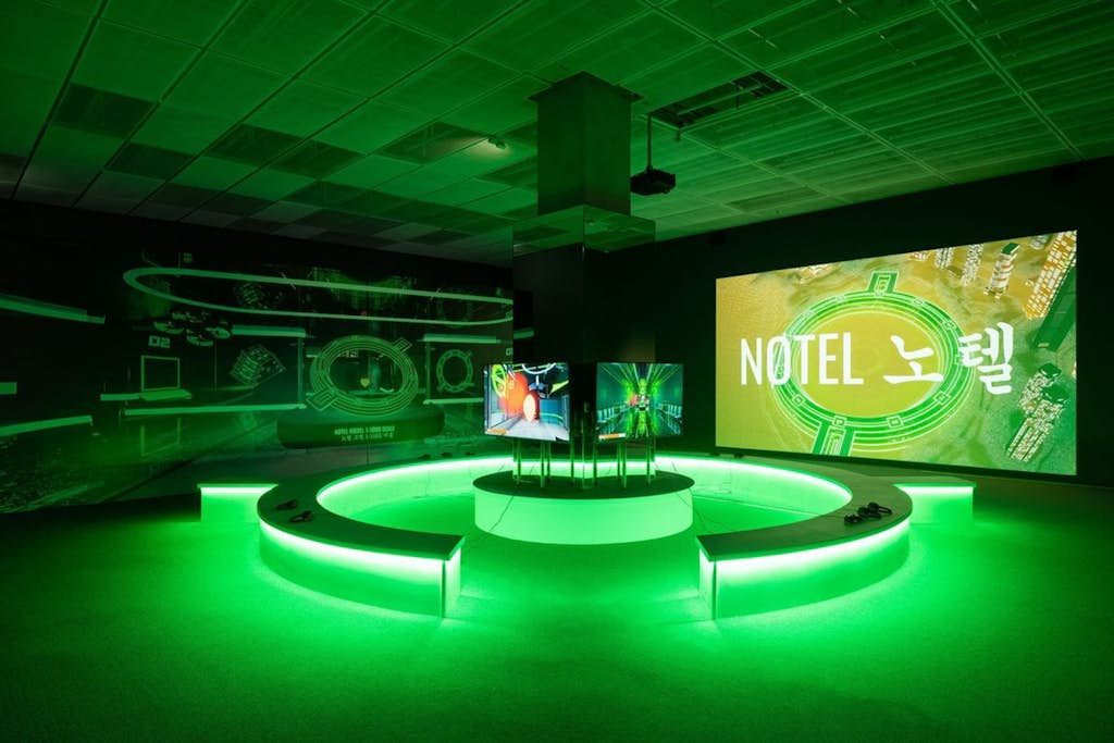 The video, shown alongside Lek’s game Nøtel (2018–2025), which invites players to aimlessly wander through the corridors of a deserted high-tech luxury hotel in Shanghai, premiered just as the art world turned suspicious of accelerationism.