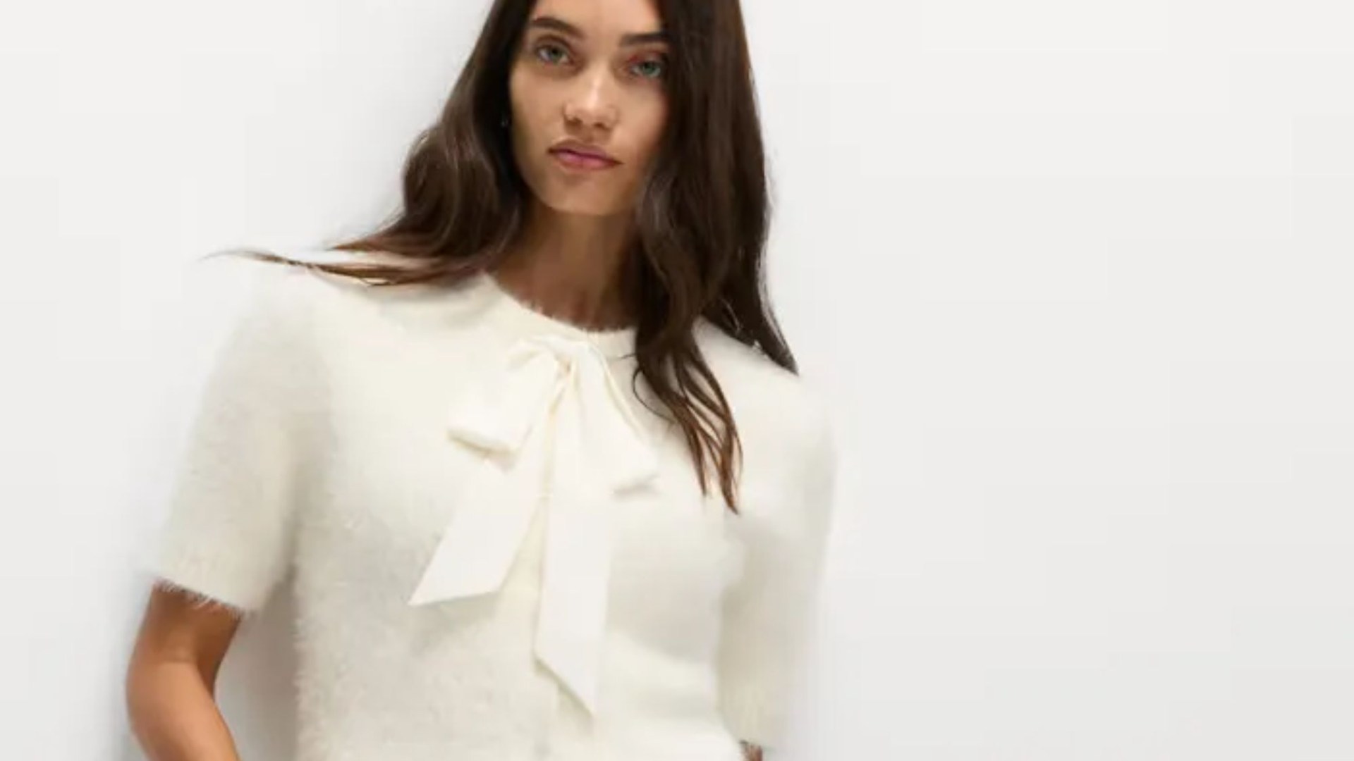 “It’s designed in a slim fit, with an elegant crew neckline and short sleeves. The bow-tie fastening at the front adds a feminine flourish.”