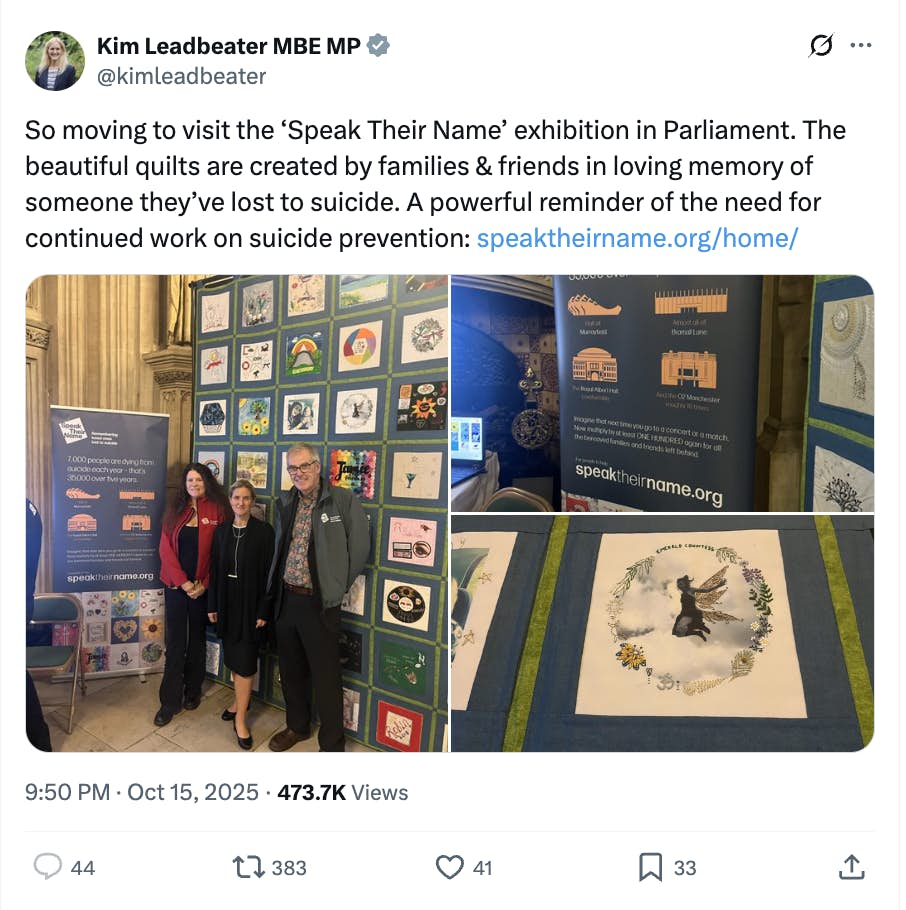 Kim Leadbeater, Member of Parliament for Spen Valley, shared on X yesterday that she visited the “Speak Their Name” exhibition in Parliament. The exhibition, which Leadbeater described as “[s]o moving”, consists of quilts made by loved ones in memory of individuals who have lost their lives as a result of suicide. The charity responsible for the exhibition, Speak Their Name, states that their “purpose is to help people in the UK who are bereaved by suicide.”