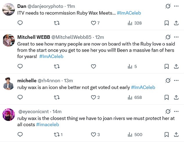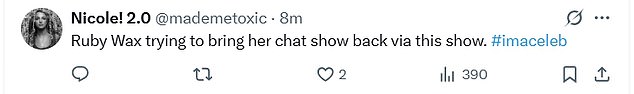 ‘Ruby Wax is an icon, she better not get voted out early’ and ‘Ruby Wax trying to bring back her chat show back via this show’.
