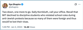 In January 2024, Shapiro posted a social media tweet calling for Kornbluth’s removal.