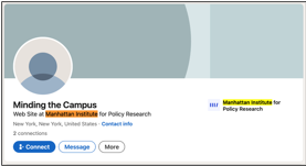 Although Minding the Campus publicly states it was acquired by the NAS, its 2021 IRS Form 990 discloses that James Piereson (a Manhattan Institute senior fellow) served as chairman until at least 2021. Additionally, the site’s vice chairman, Mark Bauerlein, an English professor at Emory University, is a regular contributor to City Journal, the flagship publication of the Manhattan Institute.