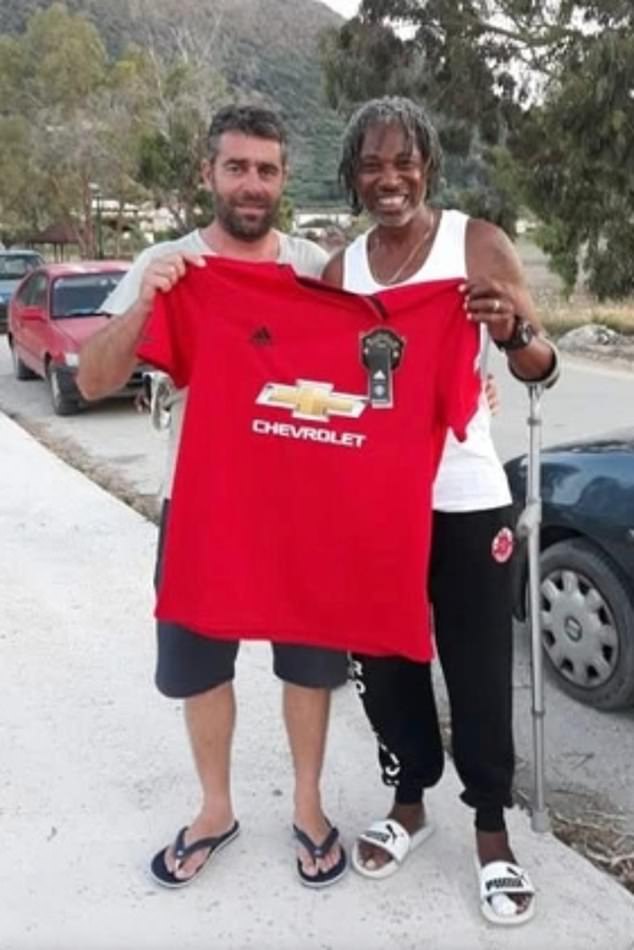 A man managed to dupe an entire Greek island that he was the legendary Manchester United player Remi Moses. Here he is pictured with a fan holding a United shirt in Zakynthos
